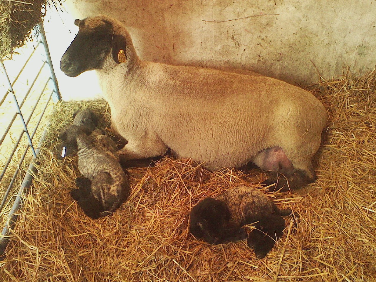 She jolts up onto all four hooves. Her lambs hides underneath her and then fight for her teats: lunch time.