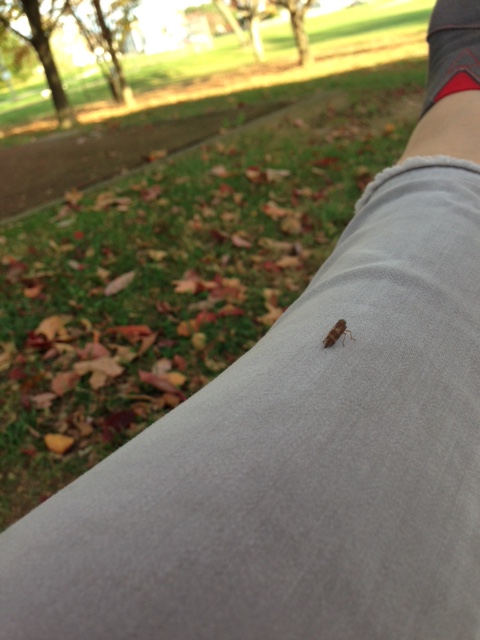 I used to scare from critters like You. My adolescent frightened feet fled from the innocence of your kind. My heart beat to the rhythm of my swallowed breaths. And now we sit In peace As your little segmented legs grip into the Fibers of my jeans.